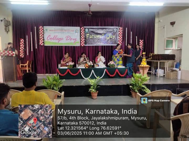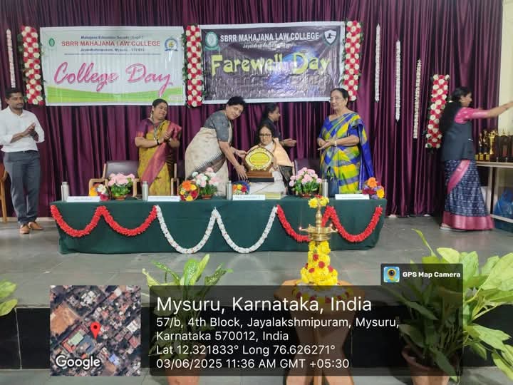 Annual Day for the academic year 2024-25 and farewell for the 3 year LLB final year students was conducted on 3.06.2025 In the presence of Chief guest for the event was Smt Indumathi, Former Vice Chancellor of Davanagere university. Smt Vijayalakshmi Muralidha, Hon. Secretary of Mahajana Education society, Smt Sarojamma, Administrative officer of Mahajana Education Society and Smt Sowmya K, Principal Mahajana Law College. The event was conducted in the coordinatorship of Smt Bhavya M, Assistant Professor SBRR Mahajana Law college.