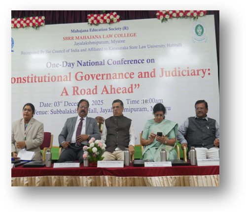 SBRR Mahajana Law College, Mysuru organized a One Day National Conference on “Constitutional Governance and Judiciary: A Road Ahead” on 3.12.2025. The programme was inaugurated by Hon’ble Justice Shri Krishna S. Dixit and Prof. Dr. C. Basavaraj, Vice Chancellor, KSLU, and presided over by Smt. Dr. T.Vijayalakshmi Muralidhar, Honorary Secretary, Mahajana Education Society, Smt. Sarojamma, Administrative Officer and Smt. Sowmya K, principal of Mahajana Law College. The chief guests emphasized the judiciary’s role in safeguarding the Constitution through judicial review, fundamental rights, and judicial activism. The Technical Sessions were conducted by Dr. M. K. Matolli and Dr. Sunil N. Bangade, focusing on constitutional governance and judicial responsibilities. Academicians, researchers, and students actively participated, with around 15 research papers presented, making the conference a grand success.