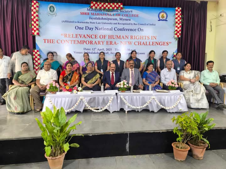 SBRR Mahajana Law College, Mysuru, organized a One Day National Conference on “Relevance of Human Rights in the Contemporary Era – New Challenges” on 12th April 2025 at Subbalakshmi Hall. The event was inaugurated by Hon’ble Mr. Justice B. A. Patil and graced by Prof. Dr. C. Basavaraju, Vice Chancellor of Karnataka State Law University, as the Chief Guest. The inaugural session was presided over by Sri T. Muralidhar Bhagavat, with key dignitaries including Dr. T. Vijayalakshmi Muralidhar, Prof. P. Sarojamma, and Smt. Sowmya K. The conference featured two technical sessions led by eminent academicians such as Prof. Bismi Gopala Krishna, Prof. K. S. Suresh, Prof. Dr. Dilshad Shaik, and Prof. Dr. J. M. Mallikarjunaiah, followed by paper presentations. The valedictory session was addressed by Prof. Dr. C. Basavaraju and attended by Prof. Dr. B. K. Tulasimala as Chief Guest. The event concluded with valuable insights on contemporary human rights issues and fruitful academic discussions.