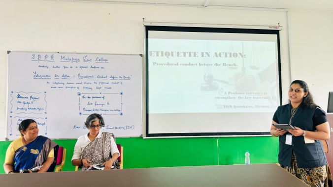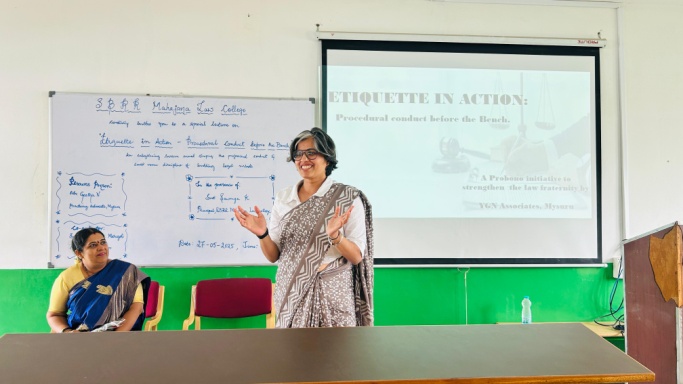 A Special Lecture for the Final Year LLB students was conducted on the topic – “Etiquette in Action “Procedural Conduct Before the Bench” by Geetha N, Practicing advocate mysuru, on 27.05.2025 A pro bono in initiative by YGN Associates – mysuru. The coordinator fo this special lecture was Smt Disha G Marigoli, Assistant Professor.